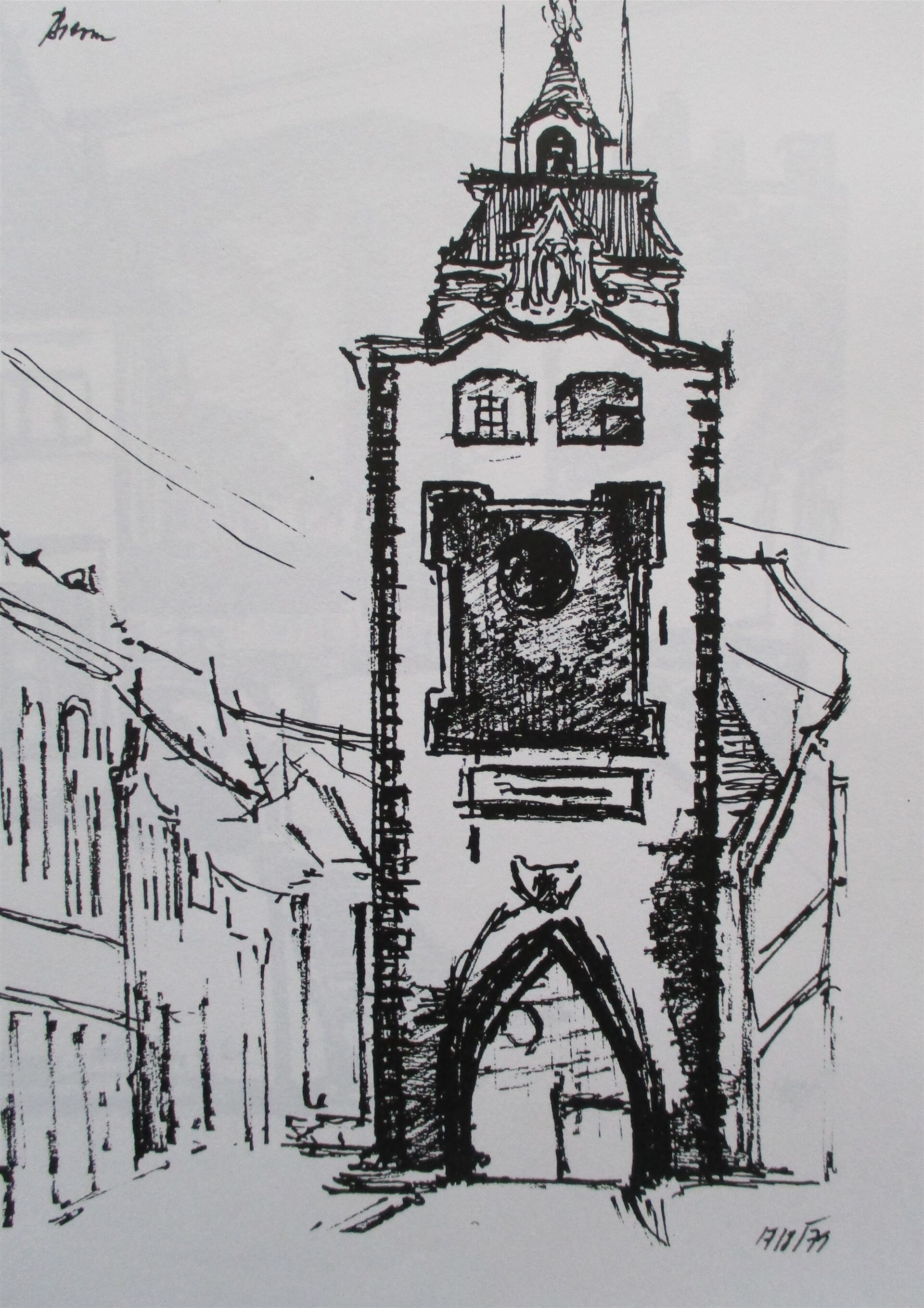 kresba "Beroun, Plzeňská brána", pero papír