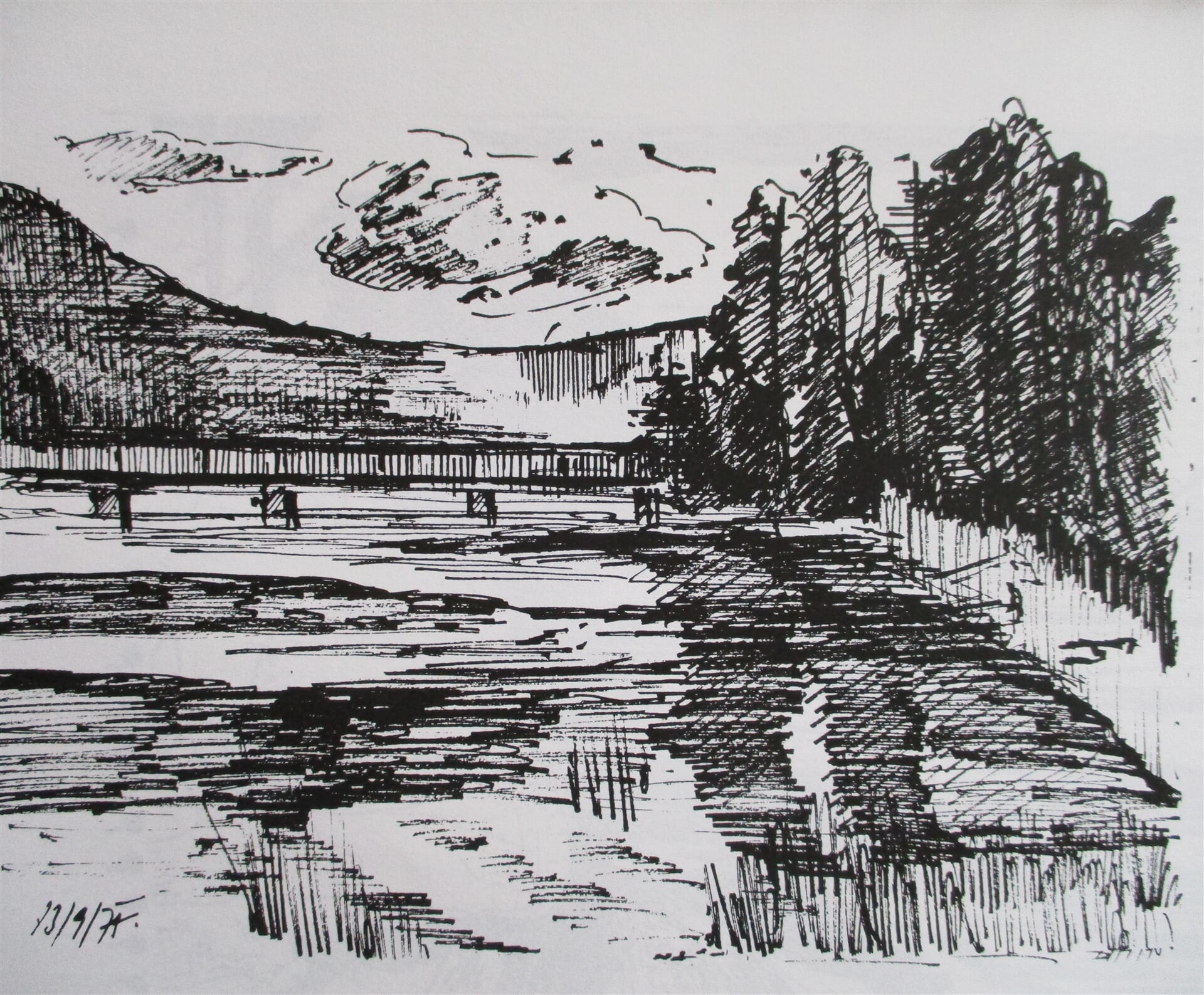 kresba "Máchovo jezero", pero papír