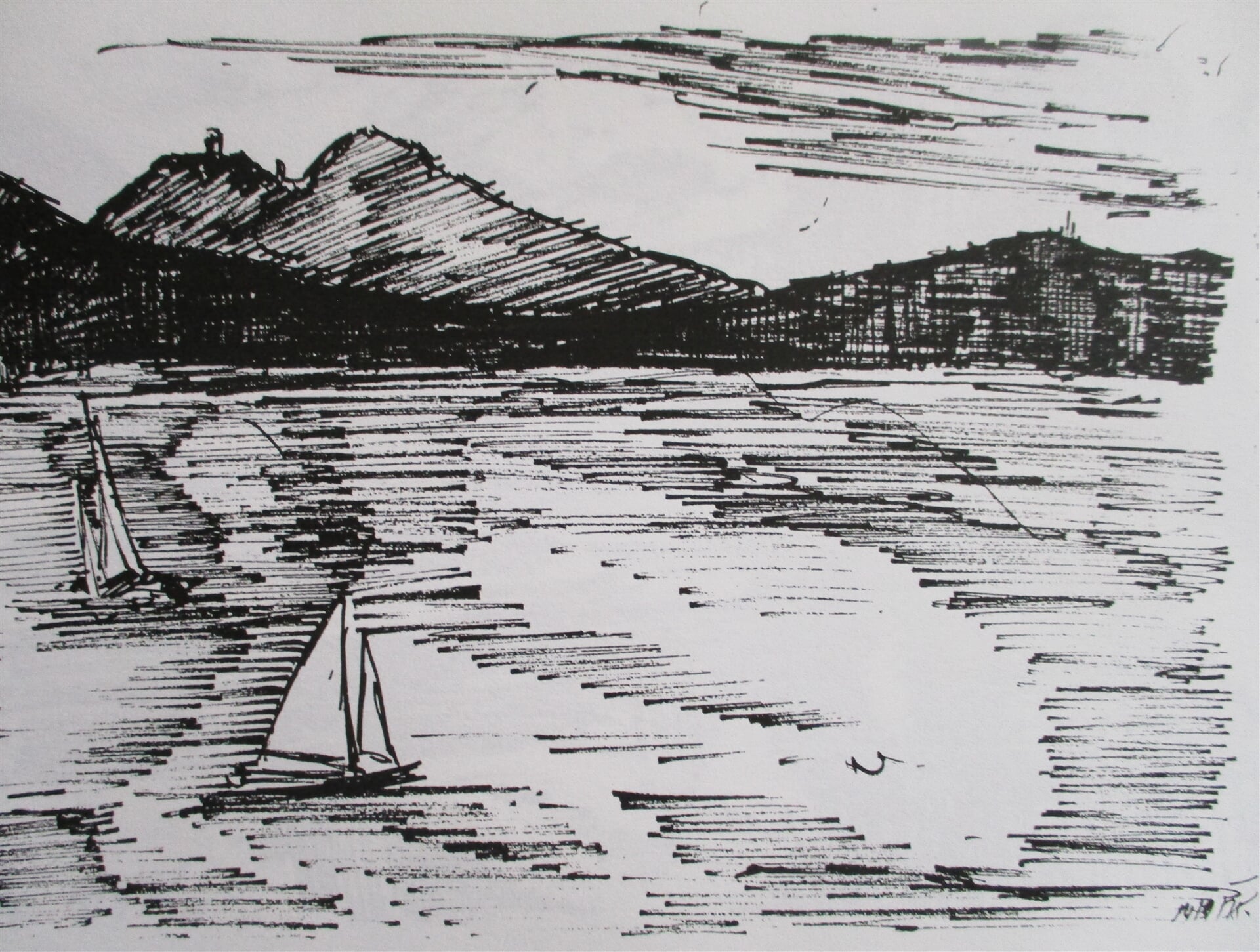 kresba "Máchovo jezero, v pozadí Bezděz", pero papír