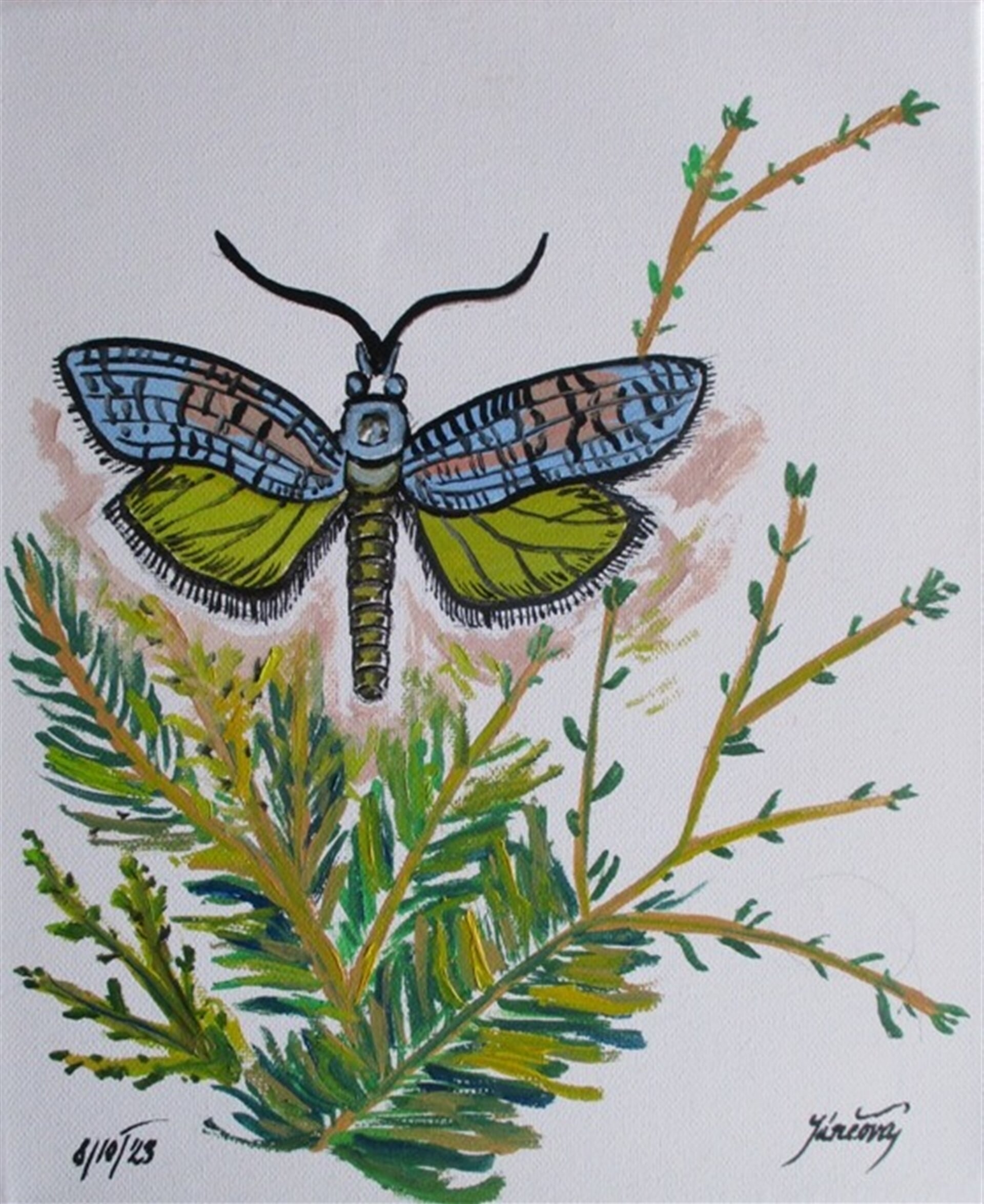 malba "Obaleč jedlový, škůdce - MOTÝLEK", olej plátno
