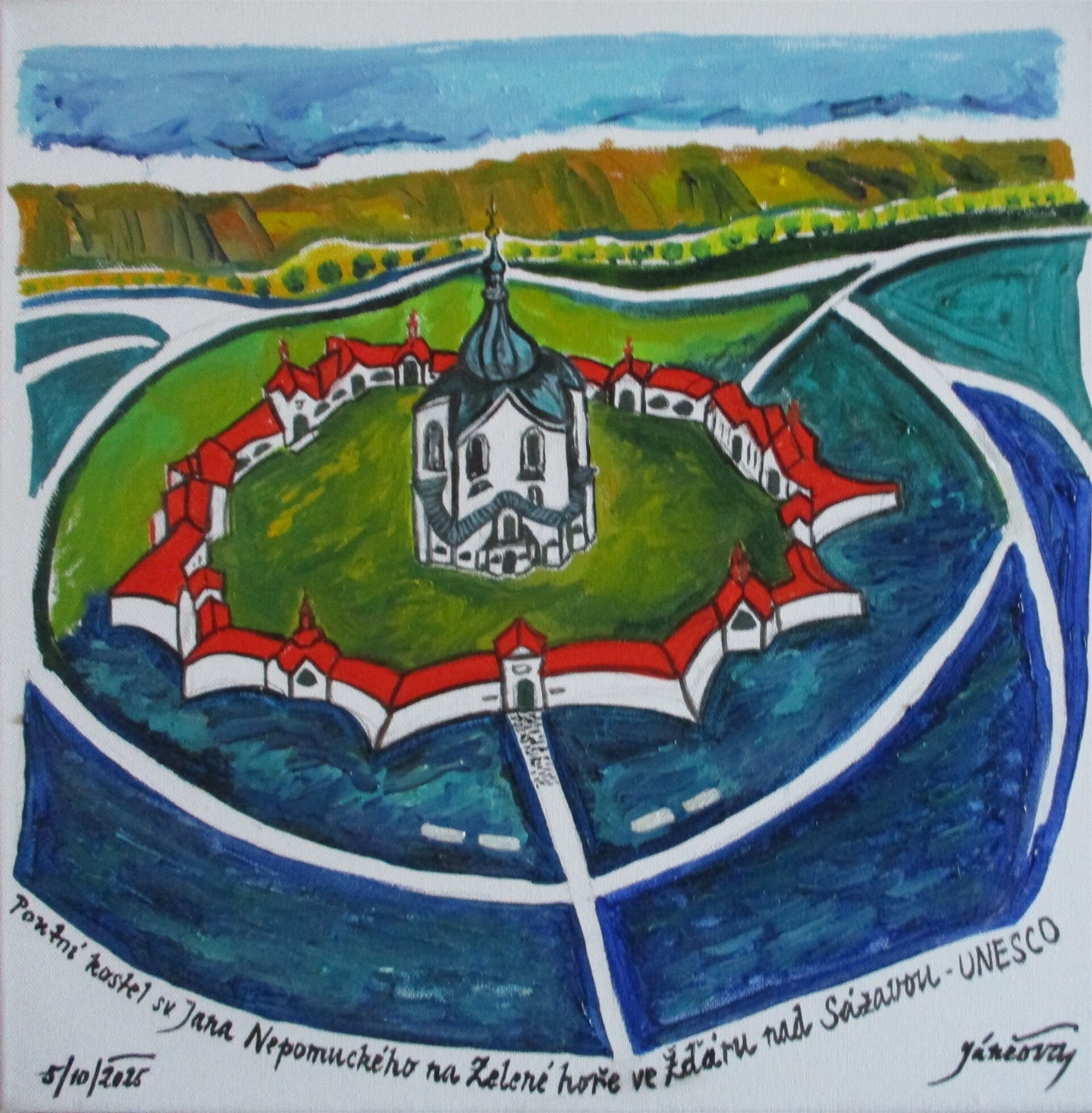 malba "Poutní kostel sv. Jana Nepomuckého na Zelené hoře ve Žďáru nad Sázavou - UNESCO", olej plátno