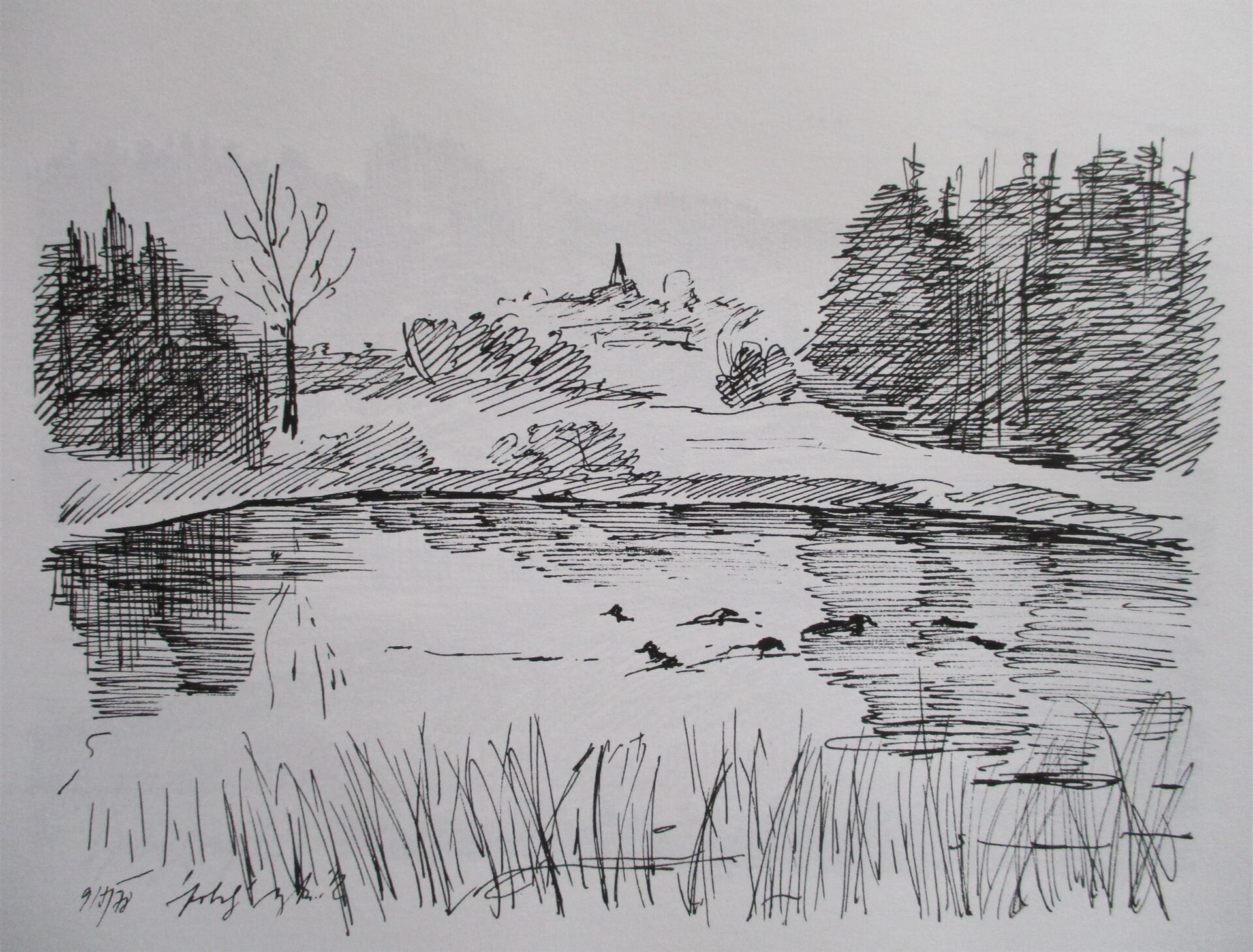 kresba "Spolský rybník, v pozadí Mladošovice", pero papír
