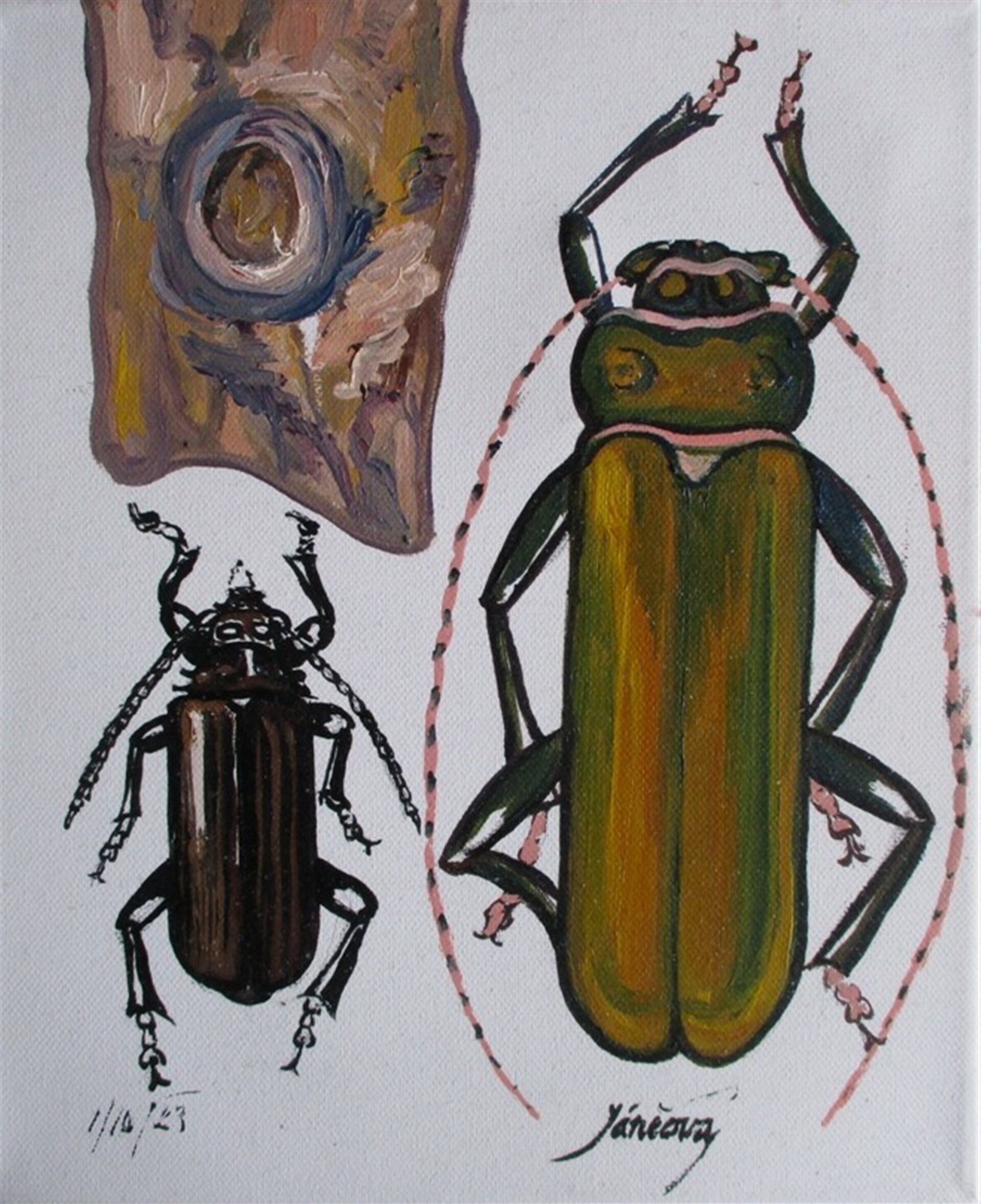 malba "Tesařík piluna, Tesařík zavalitý, škůdci", olej plátno