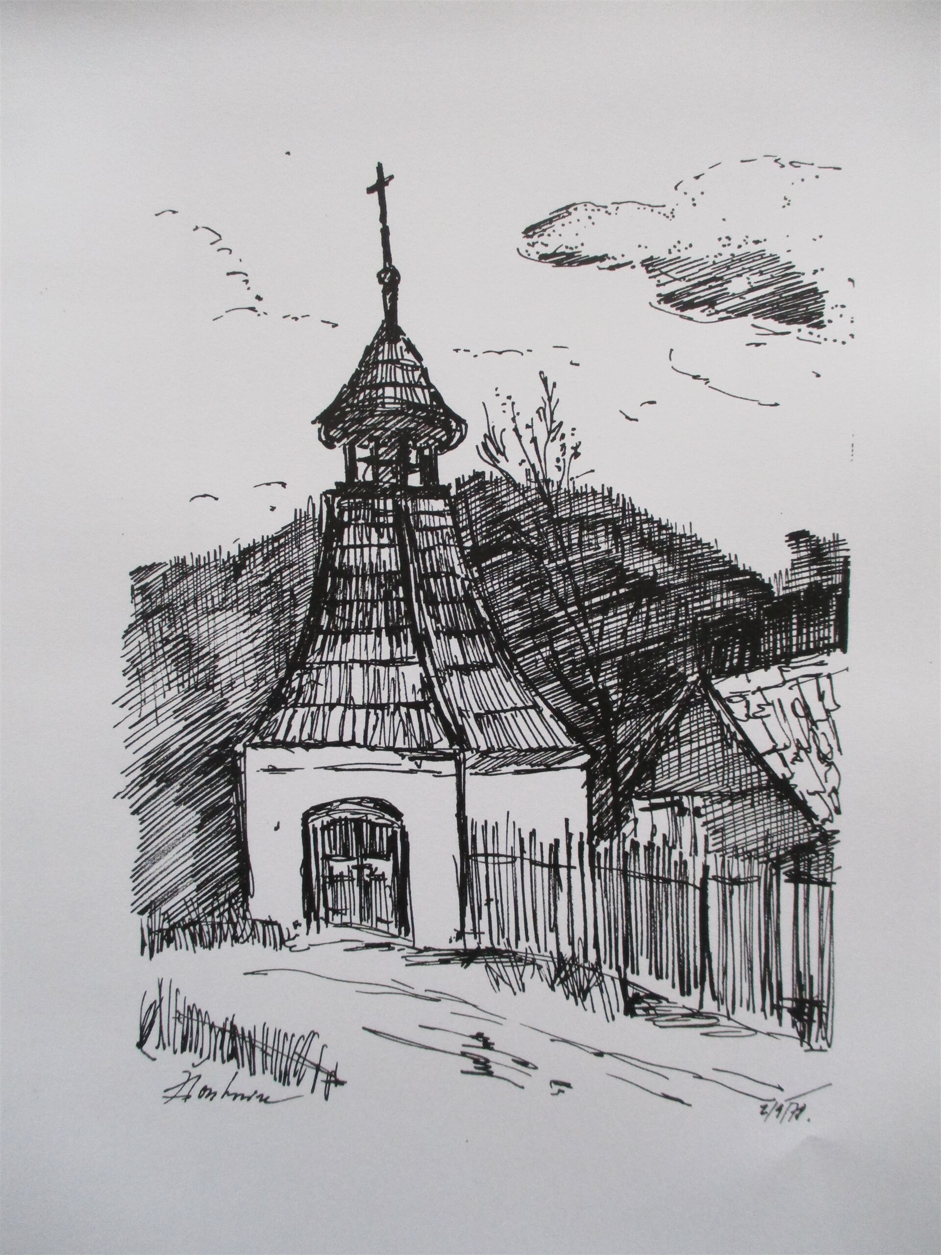 kresba "Žloukovice, kaplička", pero papír