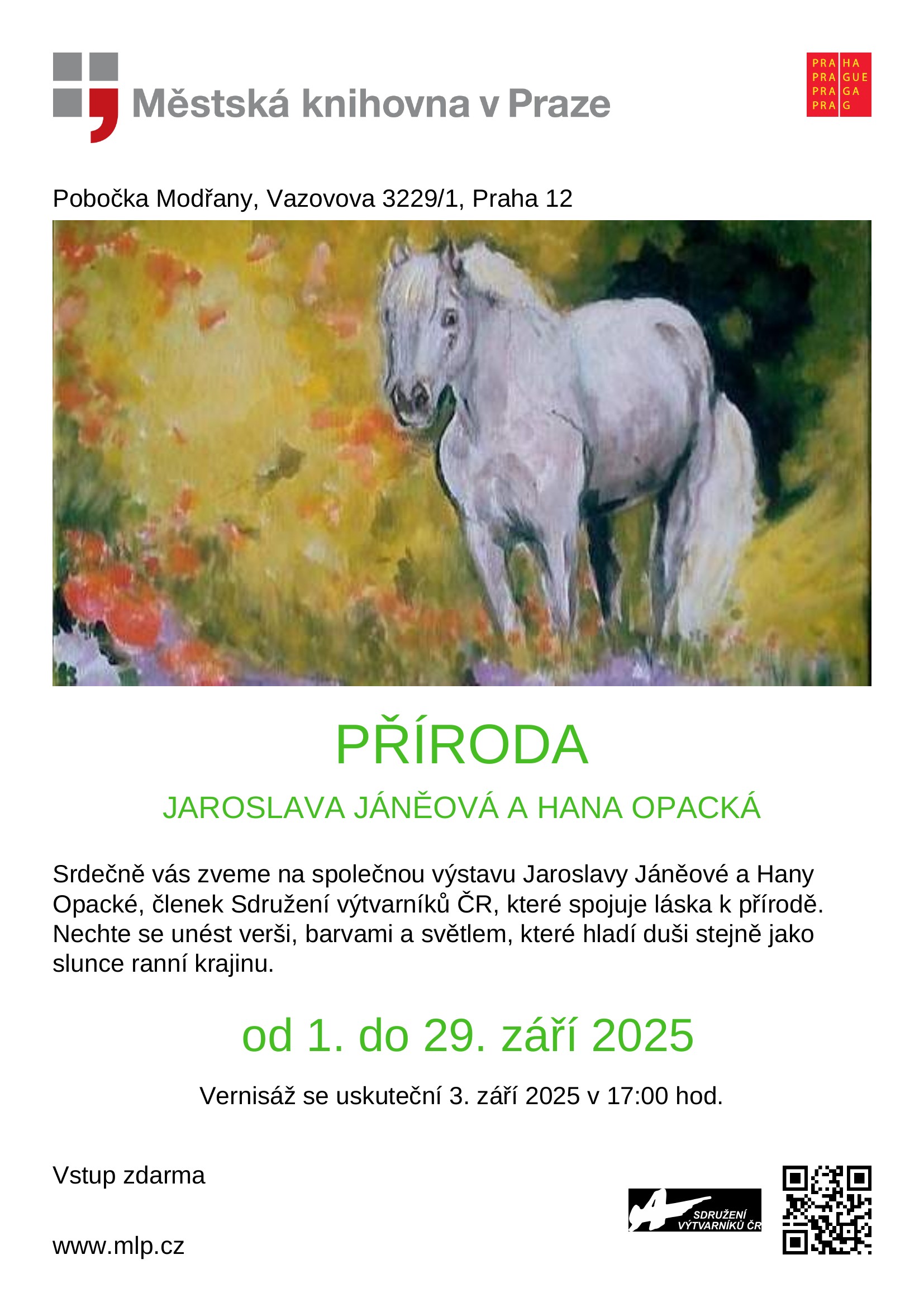 Srdečně vás zveme na společnou výstavu Jaroslavy Jáněové a Hany Opacké, členek Sdružení výtvarníků ČR, které spojuje láska k přírodě. Nechte se unést verši, barvami a světlem, které hladí duši stejně jako slunce ranní krajinu.